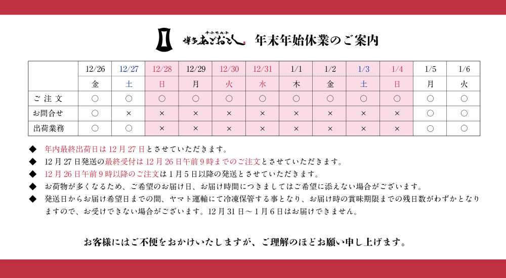 年末年始休業のご案内