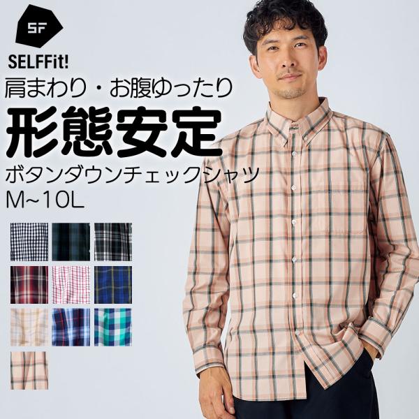 - 形態安定 チェック柄 ボタンダウンシャツ 消臭テープ付 肩まわりお腹ゆったり セルフフィット M-10L