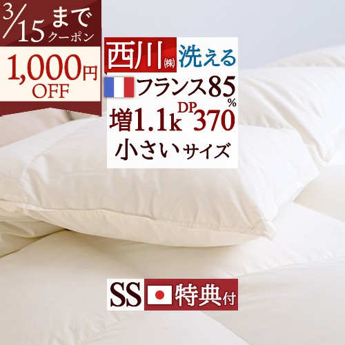 あったかダウンがお買い得!しっかり1.1kg詰めた羽毛布団。シングルより小さいセミシングルです。介護用やお子様用に。