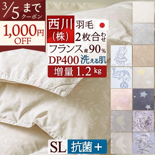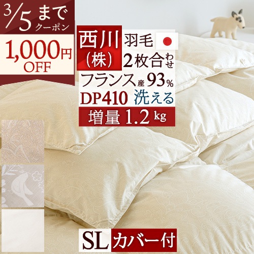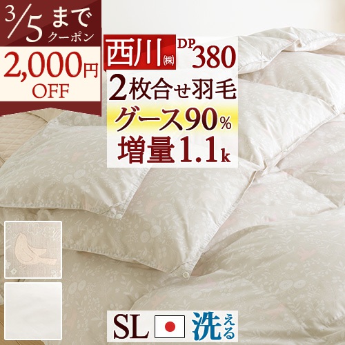 グースは弾力性があり、保温力も抜群。オールシーズン使えてとっても便利です!コインランドリー対応の2枚合わせ羽毛布団。