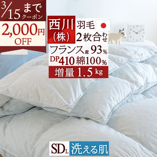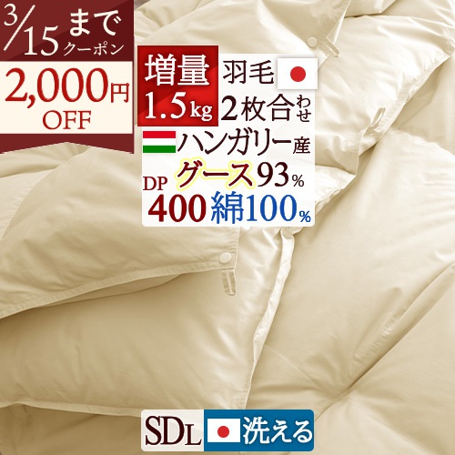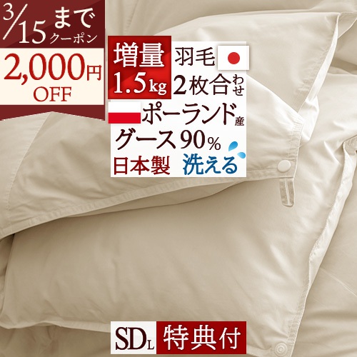 グースは弾力性があり、保温力も抜群。オールシーズン使えてとっても便利です!コインランドリー対応の2枚合わせ羽毛布団。