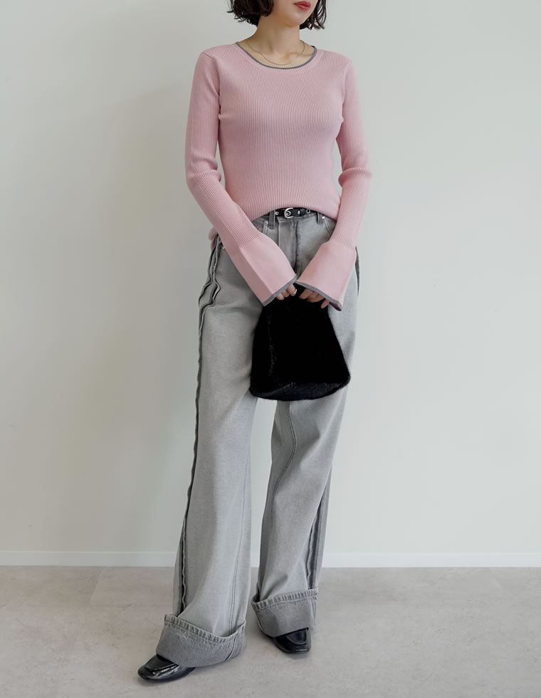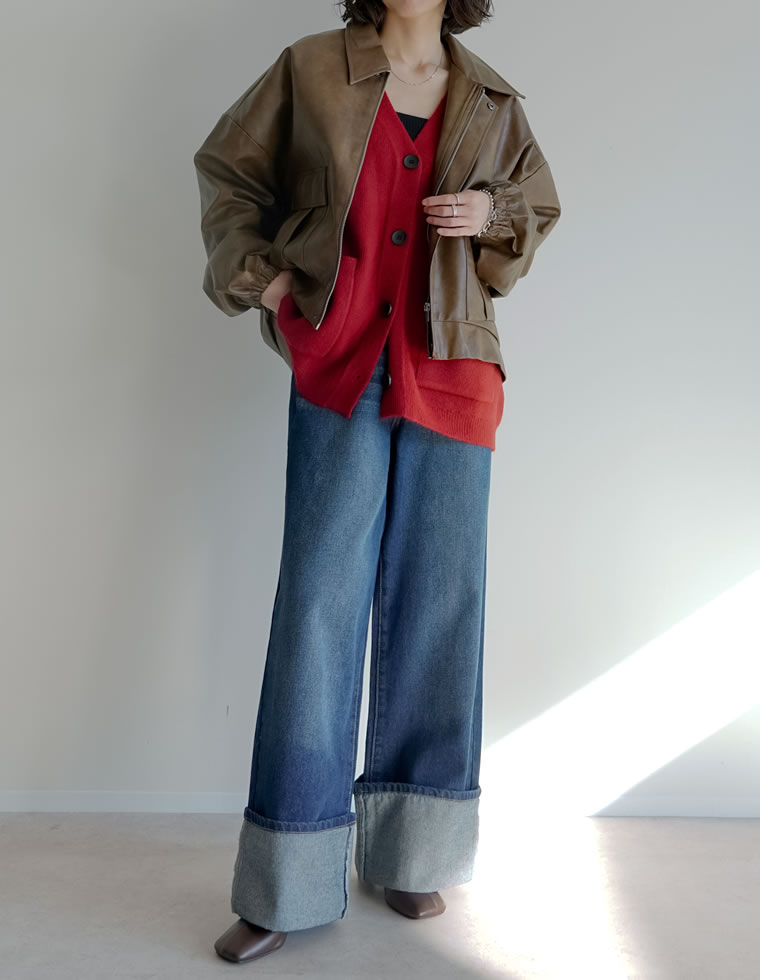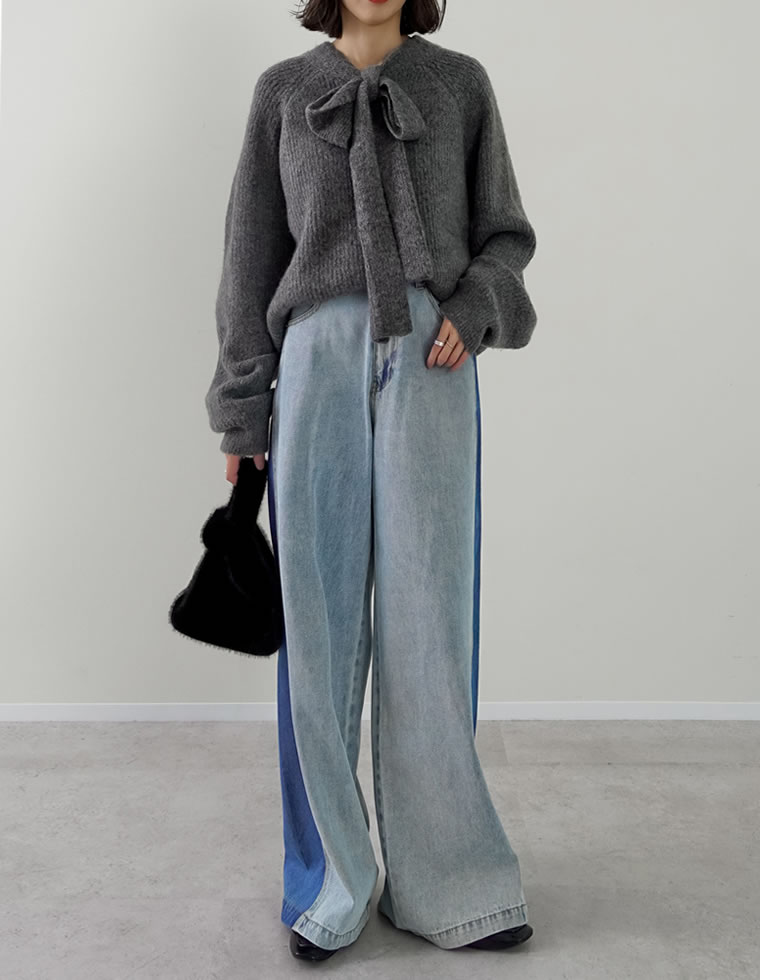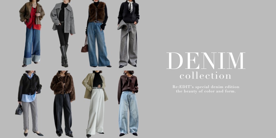 Re:EDITの人気デニムといえば、バレルレッグカーブデニムパンツ。 長めの丈感とゆったりしたシルエットが今の気分にぴったりで、ワイドなのに美しいラインが出るのが魅力です。 甘さのあるリボンニットはカジュアルなブルー、かちっと感のあるジャケットはネイビーやブラックでクラシカルにまとめると◎ 豊富なカラー・サイズなので、自分にぴったりの一本をみつけてくださいね。