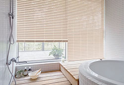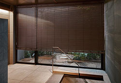 ベネウッド・防炎に加えて耐水性を持たせた木調ブラインドはホテルのビューバス等におすすめです。もちろん一般住宅の浴室にも。ワンランク上の癒し空間を演出します。