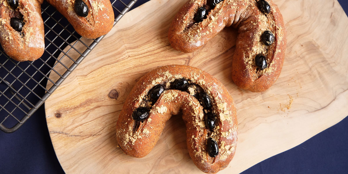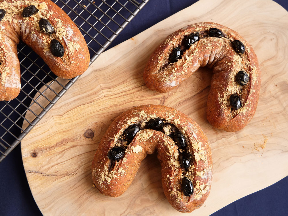 きな粉とふっくら炊いた黒豆を生地にも具材にもふんだんに使用し、午年を意識した馬蹄型に焼き上げた、ヘルシーでおめでたいパンです!具材にクリームチーズを使っているので、香ばしいきな粉や黒豆とミックスされ、優しくさっぱりした甘さに仕上がります。