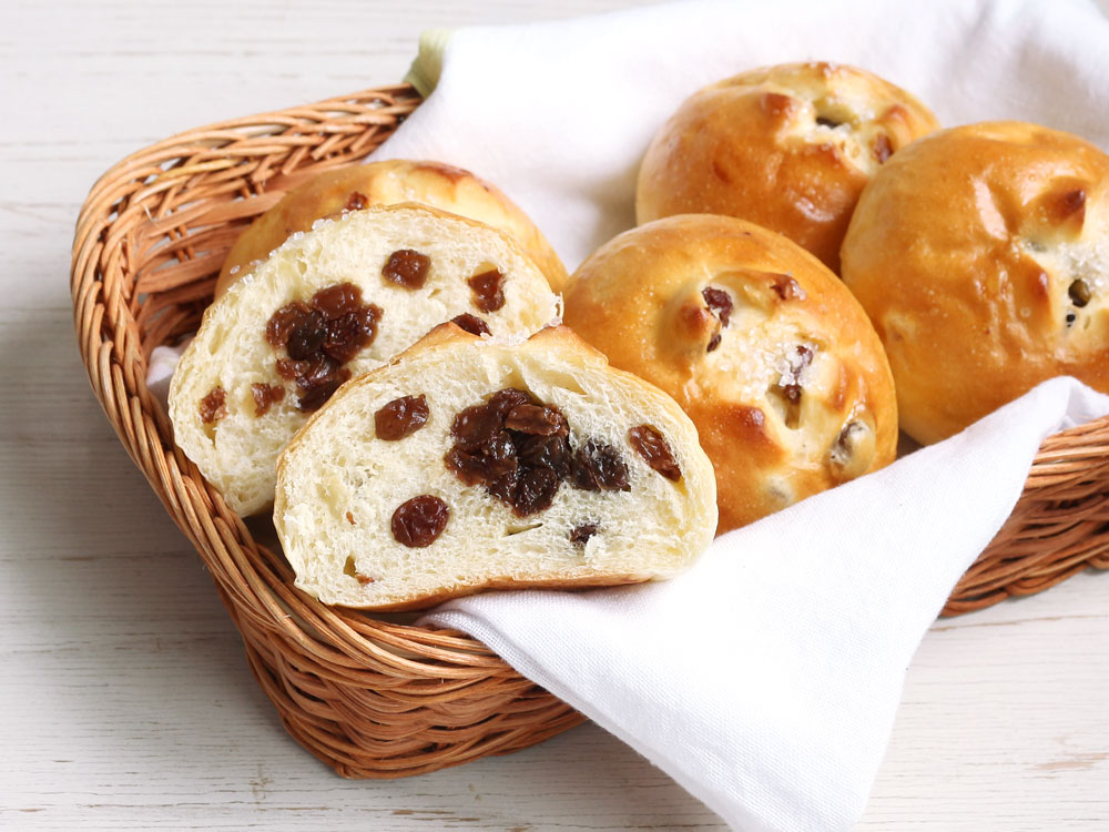 レーズンなどの混ぜ物をする場合は、一般的には通常の食パン生地より1.2~1.3倍量の総生地量が目安となります。
