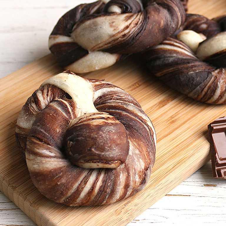 チョコシートを折り込むことで出来る、しましまの層が綺麗な見た目の折り込みパンは、 はるゆたかブレンド「プレミアム7」を使い、白く焼き上げることで、より一層ふっくらでモチモチとした食感をお楽しみ頂けます。