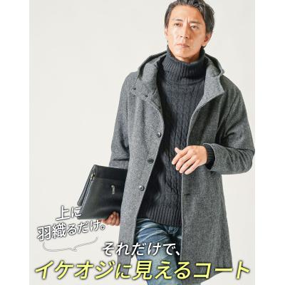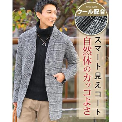 40代メンズ3点コーデセット グレンチェックロングコート×白タートルネックニット×黒スリムチノパンツ