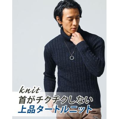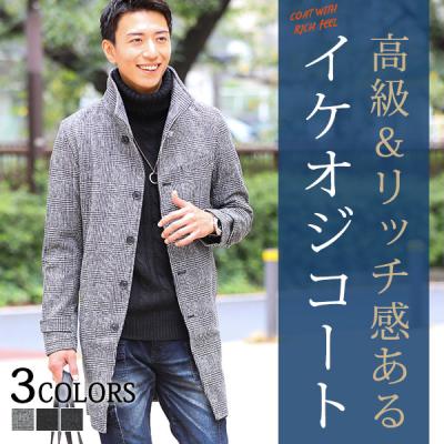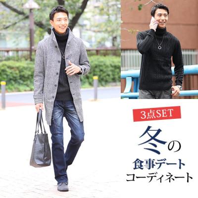 グレンチェックスタンドカラーコート×黒タートルネックニット×デニムパンツの3点冬コーデセット