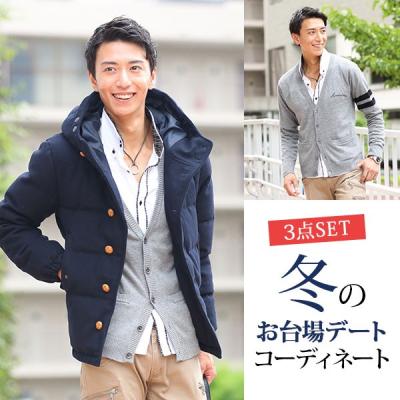 ★セット買い★ネイビーダウンジャケット×グレーカーディガン×白シャツの3点トップスコーデセット