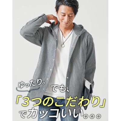 ヒッコリーストライプフード付きワイヤー入りセミロング丈ボタンシャツパーカージャケット