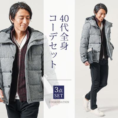 40代メンズ冬の3点コーデセット グレーツイード中綿ダウンジャケット×ワインニットアウター×黒スリムチノパンツ