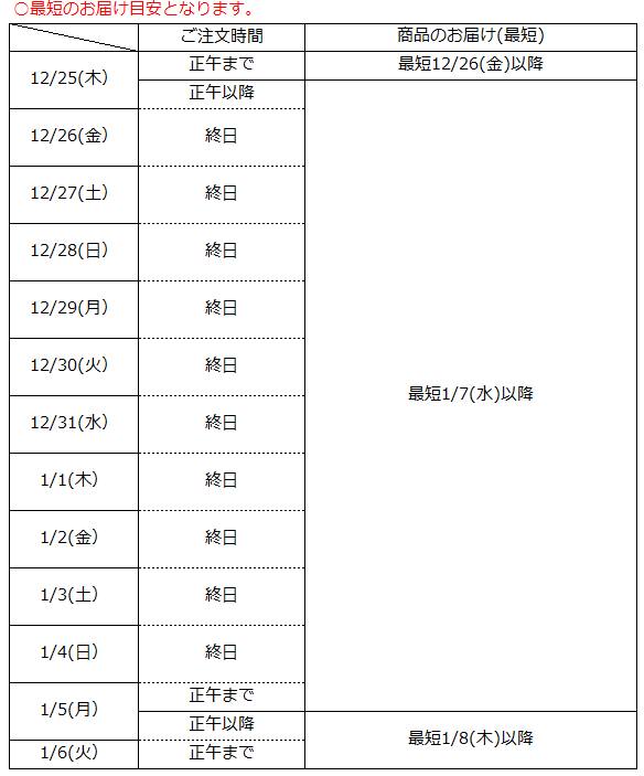 ※年末年始期間中は運送会社の営業体制の都合上、出荷作業は行いませんが、