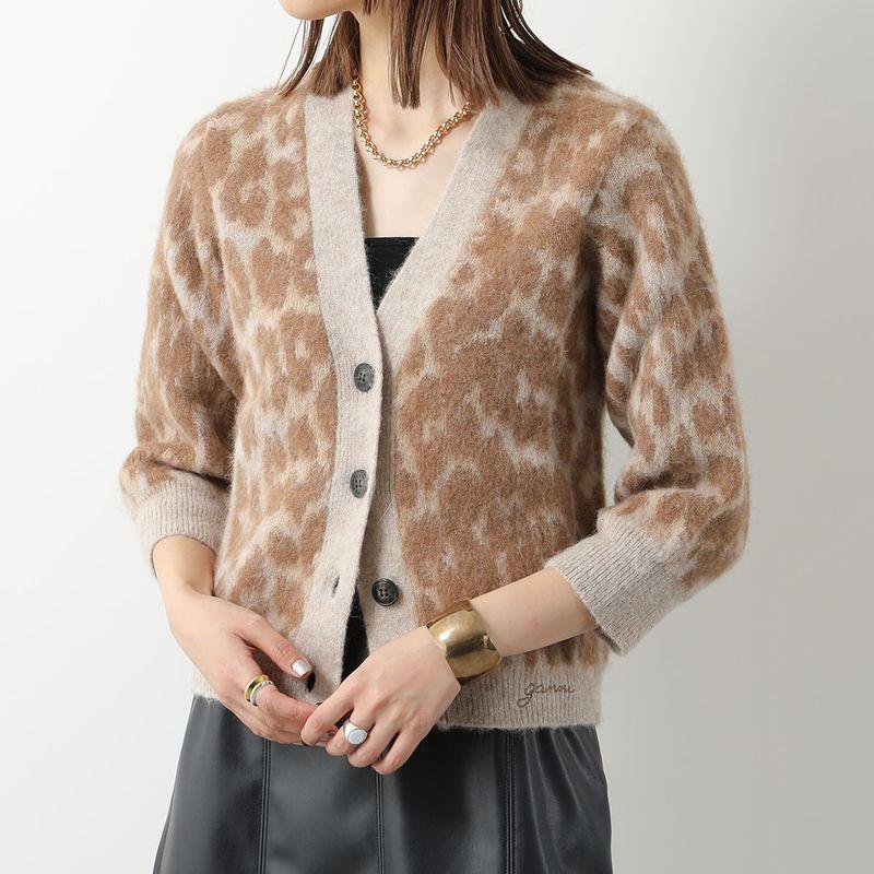 GANNI ガニー カーディガン Leopard Jacquard Cardigan K1976 2596 レディース 長袖 レオパード アルパカブレンド ロゴ刺繍 Vネック 765/Timber-Wolf
