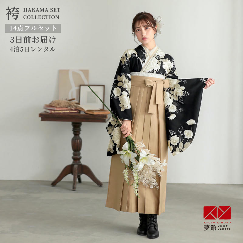 ロココ調の花をモチーフにした黒地の着物に、草花の刺繍を施したカーキの袴をコーディネート。シックなカラーが特徴の個性的で大人可愛い雰囲気のお着物です。
