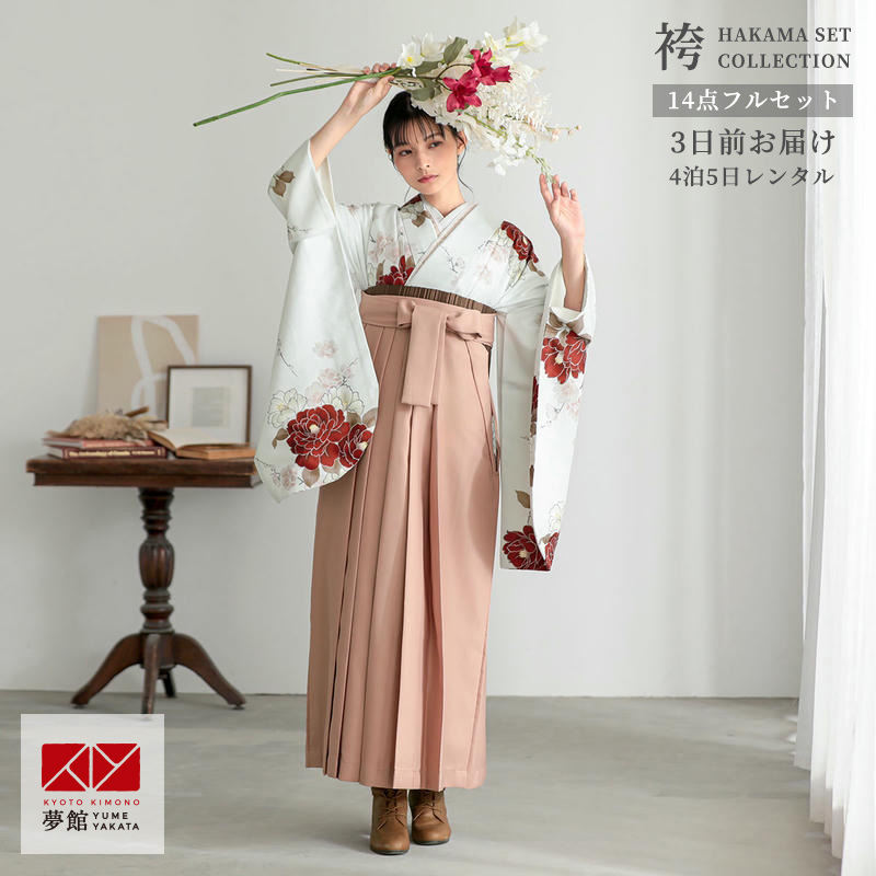 ダマスク文様に薔薇の花をモチーフにしたベージュ地の着物に、スモーキーピンクの袴をコーディネート。シックなカラーが特徴の大人可愛い雰囲気のお着物です。
