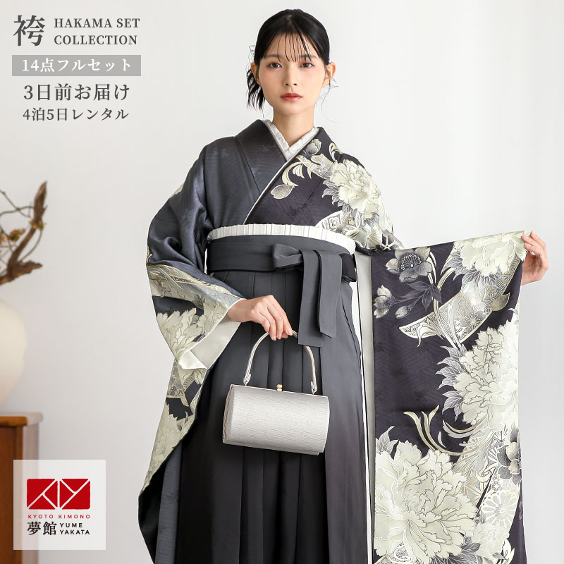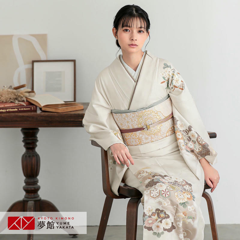 アネモネの花をモチーフにしたベージュ地の着物に、ダークグレーの袴をコーディネート。セピア調のシックなカラーが特徴です。